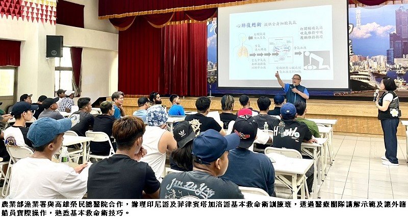 為提升我國遠洋漁船船員急救知識,農業部漁業署與高雄榮民總醫院合作,辦理印尼語及菲律賓塔加洛語基本救命術訓練班,透過醫療團隊講解示範及讓外籍船員實際操作,熟悉基本救命術技巧,增加遠洋漁船船員在緊急時刻做出正確處置。