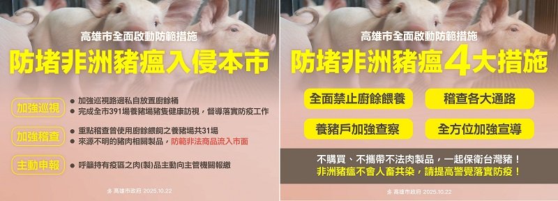 配合中央政策,自10月22日起全面禁止廚餘餵養,由環保局統一回收處理、針對158處高風險場加強稽查,嚴防違規情形,機關、學校廚餘聯繫轄區清潔隊依量能協助清運,針對餐館、旅館等事業單位由事業單位委託民間清運業者送至處理廠或環保單位指定地點。另有關高雄市營養午餐食材採用三章一Q,可溯源台灣食材,因應近日豬肉供應狀況視情況更改菜單,以維持小朋友正常蛋白質攝取。