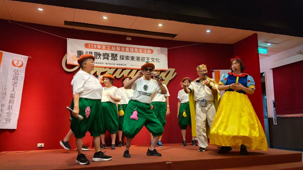 & & & 在「重陽節敬老活動」這天的午餐歡樂時光中,「快樂不老劇團」演出由弘道潮州志工站副站長洪碧玲改編的《白雪老公主》劇碼,藉童話人物步入老年的想像,演出的七位「小矮人」風趣地列舉了數種年長者在生活中常見的行為模式,例如:「一句話問來擱問去、隨講隨忘記」、「脾氣不好,常常愛生氣」、「半眠不睡,偷偷走出去」等,以詼諧幽默的生活情境,巧妙帶領志工和長輩們認識到失智症初期的可能徵兆,寓教於樂。洪碧玲分享,她編寫此劇的靈感源於個人經驗,由於婆婆曾罹患失智症,家人過去因缺乏對初期症狀的認識而錯失了早期介入與因應的契機,讓她深知「認識」與「陪伴」的重要性,所以希望藉由戲劇來傳遞。