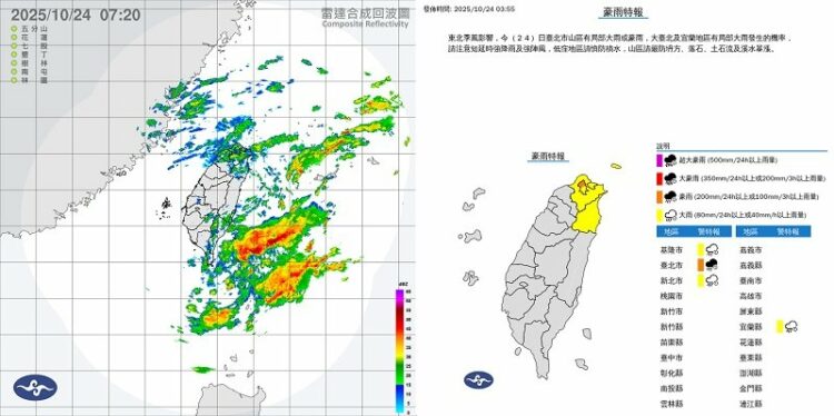 今天是光復連假第一天,根據中央氣象署指出,今(24)日受東北季風影響,迎風面水氣偏多,北北基及宜蘭4縣市清晨持續發布豪、大雨特報。另外今日桃園及花蓮地區也會有短暫陣雨,並有局部大雨發生的機率,竹苗、台東地區及中南部山區有局部短暫陣雨,其他地區為多雲的天氣;連日降雨,山區嚴防坍方、落石及溪水暴漲,外出務必小心路況,注意安全。