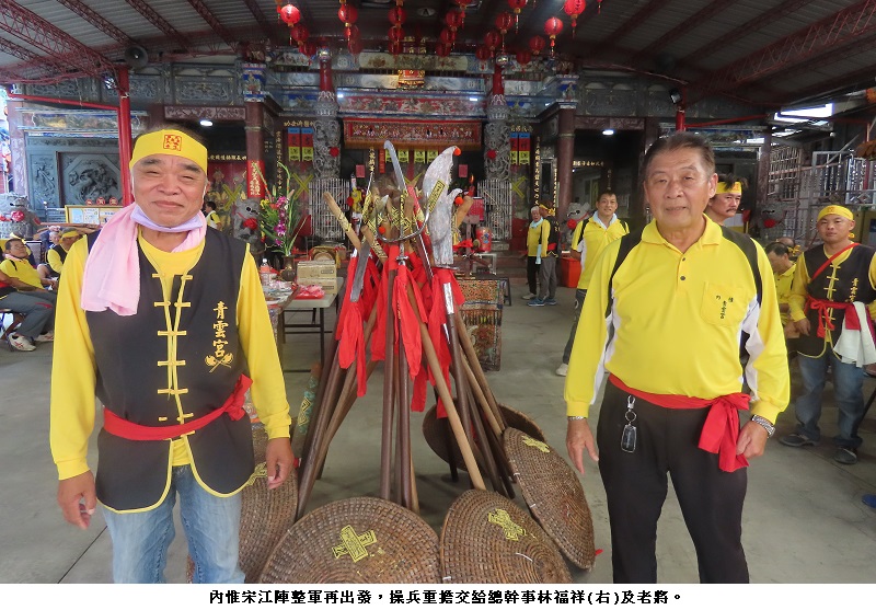 為了配合昨天的「慶成謝土」慶典及迎接年底的謁祖進香,「休兵欠操」十幾年的內惟宋江陣昨天在老祖廟的廟庭歸隊,重整旗鼓,準備再展身手。