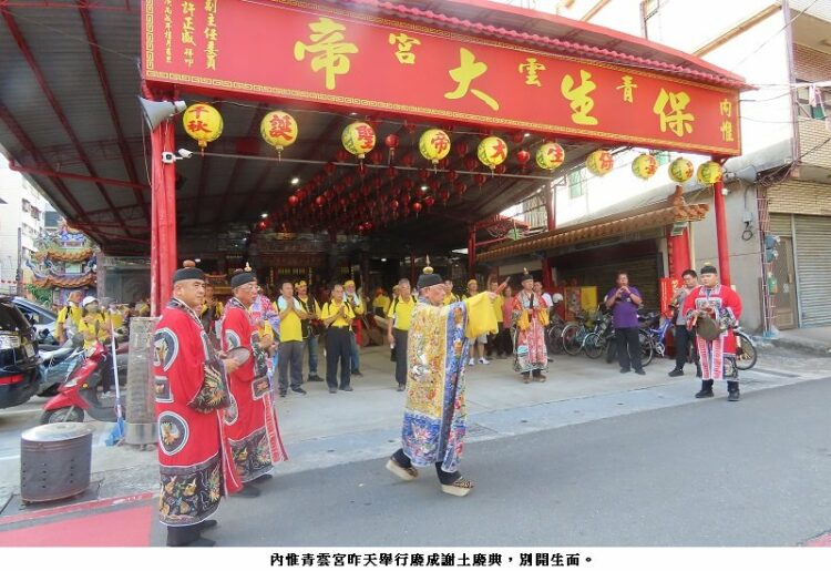 香火鼎盛的鼓山內惟青雲宮 (俗稱老祖廟),昨天 (24日)舉行別開生面的「慶成謝土」儀式,有些科儀關在廟內進行,一般人難得一見,這項慶典同時為該廟今年底重返左營軍區內「桃子園」謁祖尋根探源暖身,信眾無比期待。「休兵」多年的內惟宋江陣也在昨天歸隊整軍,準備再展身手。