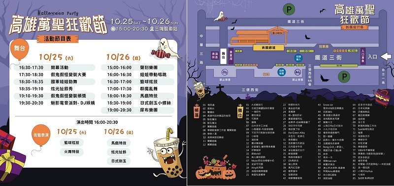 大高雄市觀光商圈總會說明,活動期間除了匯聚80家知名在地美食品牌,包括黑橋牌、白木舟手工冰城、另起滷灶、頑固油飯等人氣品牌一次到齊外,更有日本劍玉表演、馬戲炫技秀、樂團Live及亞洲百大DJ妖嬌的電音派對。透過市集串聯、舞台互動與文化體驗,並結合商圈周邊重要景點百年三塊厝車站及百年蒸汽火車變身萬聖主舞台,不僅讓民眾玩得盡興,也讓商圈品牌及特色能被更多人看見,持續提升城市觀光熱度與商業動能。更多活動資訊請上大高雄市觀光商圈總會(https://www.facebook.com/ikhtw/)臉書查詢。