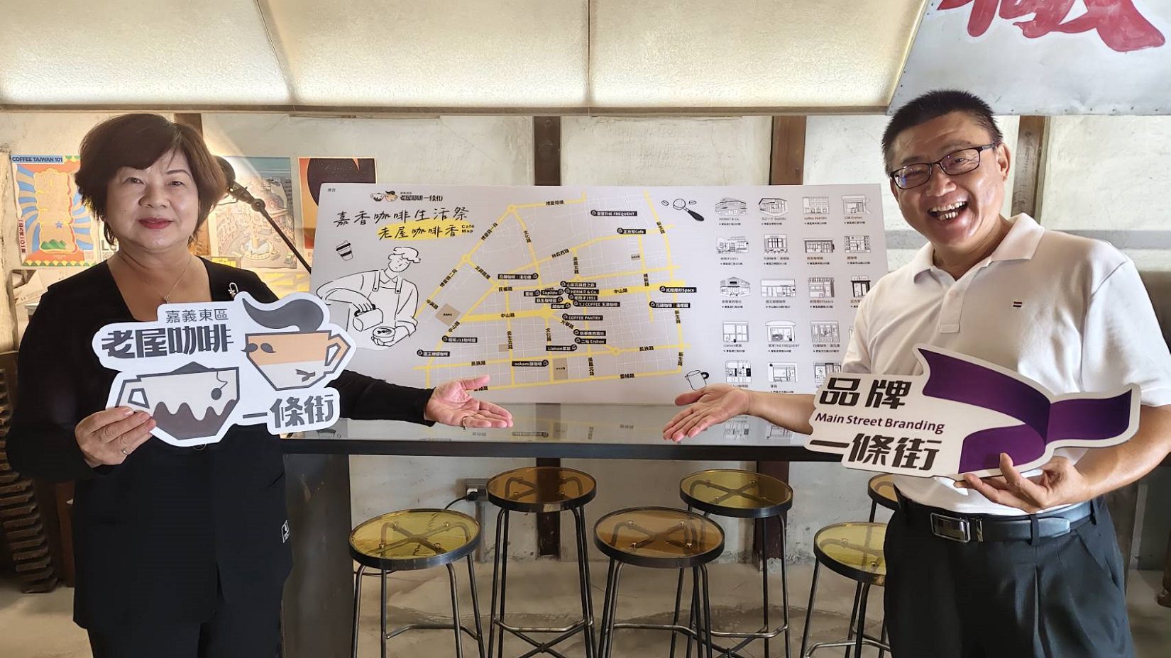 ▲嘉義市商圈文化促進協會理事長劉慶宗(右)與嘉義諸羅街區科技發展協會理事長游貴襴(左)在「街區咖啡遊程地圖」前合影。(圖/嘉義市商圈文化促進協會提供)
