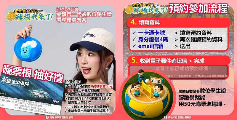 另外,今年高雄市政府「學生50元看球優惠方案」10/22起開放預約,凡持一卡通數位學生證的高雄市國小、國中、高中職及大專院校學生,都能以50元入場觀賞原價300至400元的職業籃球賽事。海神隊全季主場都在優惠範圍內,10月22日起開放預約,名額有限。運發局提醒,學生只要憑證件購票即可輕鬆入場,歡迎年輕球迷把握機會,親自到場體驗海神主場的熱血氛圍,加入藍色浪潮,一起成為海神最強後盾,高雄市17所大專院校學生及高中職以下非記名數位學生證者,請攜帶學校核發的實體學生證現場驗證購買當日場次,每場數量有限,售完為止,詳情請參閱活動網頁 https://i-pass.co/6lq94e ,更多賽事資訊,請上高雄市政府運動發展局臉書(https://www.facebook.com/ksdkcg)查詢。