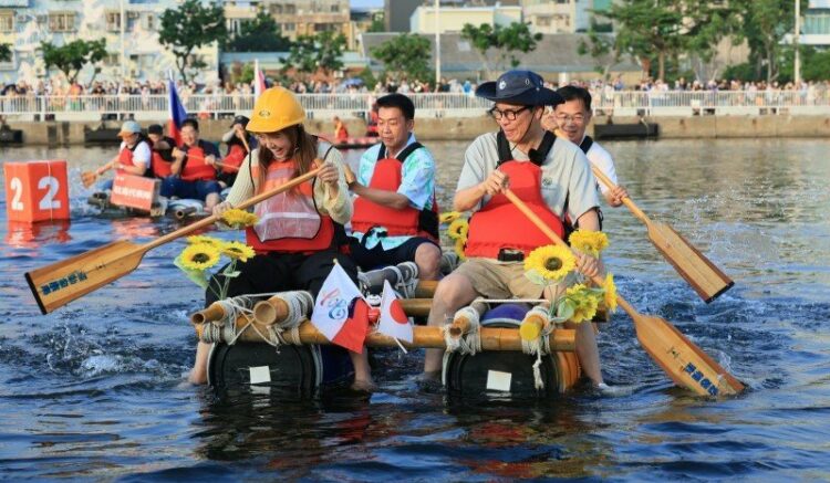 2025高雄海洋派對系列活動-創意造筏競賽暨SUP體驗今(25)日熱鬧登場,延續去年好評,今年號召超過百隊好手以環保回收物打造創意船筏,於大港橋水域競速。市長陳其邁攜手日籍人氣YouTuber「Mana」組隊下水挑戰,以象徵臺日友好與國際交流的精神迎戰,陳其邁賽前信心十足,並向對手喊話力拚第一,現場活力滿滿、歡笑聲不斷。