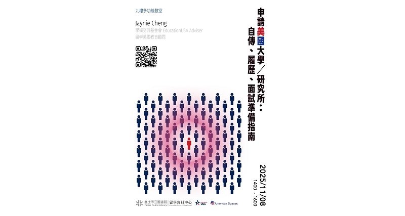 臺北市立圖書館留學資料中心於11月8日(六)下午2時邀請學術交流基金會留學美國教育顧問Jaynie Cheng講師,分享自傳(Personal Statement)、履歷(Resume/CV)撰寫策略以及面試應對準備三大主題,協助學生在申請過程中展現個人特色與專業潛力,無論你正準備申請大學、研究所,或希望為未來的留學之路預作準備,都將提供完整且實用的指引,協助你在眾多申請者中脫穎而出,邁向夢想中的學術殿堂。
