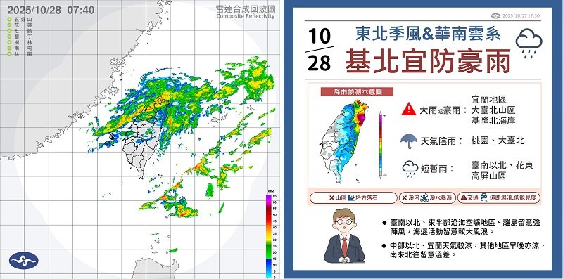 氣象署預報員林定宜表示,受東北季風影響,週二、週三北部及宜蘭天氣較涼,其他地區早晚亦涼,中部週二亦稍涼。週二受華南雲系東移影響,桃園以北有雨,基隆北海岸、大台北山區及宜蘭地區有局部大雨或豪雨機會,中部以北及花蓮地區短暫雨,台南、台東、恆春半島及高屏山區有局部短暫雨,其他地區為多雲。