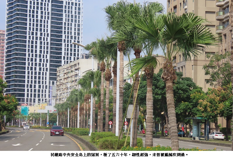 蒲葵與大王椰子風吹不倒,主因在樹幹內纖維質的韌性,事實會說話,省錢又省事,為何公部門不多做選擇?綠化市容是得顧生態樣性的多元,但亂種一堆經不起風吹的,就只能等著用卡車載衛生紙在颱風過後擦屁股。累死清潔隊及公園管理處,清理業者再賺一筆災難財。