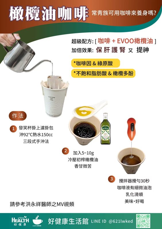 最近坊間推廣橄欖油加咖啡,腎臟科洪姓名醫也介紹給腎友參考,這種橄欖油咖啡是一種將橄欖油加入咖啡中飲用的方式,能增加咖啡的滑順度和濃郁口感,並為咖啡帶來額外的香氣。