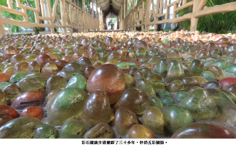 步道上的彩石不是天然的,而是人造的彩色鵝卵石,因為不可能有色彩那麼鮮艷的天然鵝卵石。踩踏的里民,管它是天然的或人造的,「彩色的就是漂亮,踩起來就是爽」。