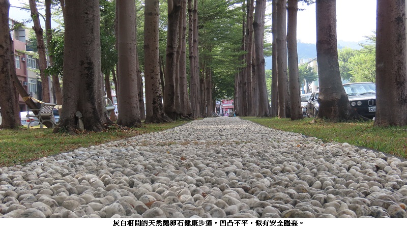 每一條的健康步道,都嚴禁穿鞋,所以,福壽里那條踩石步道至今還是彩色的,沒有褪色,其他的都是灰白相間的天然鵝卵石,歷經數十年,灰白如昔。江惠唱紅的「褪色的戀情」,不適合在健康步道上邊踩邊唱。