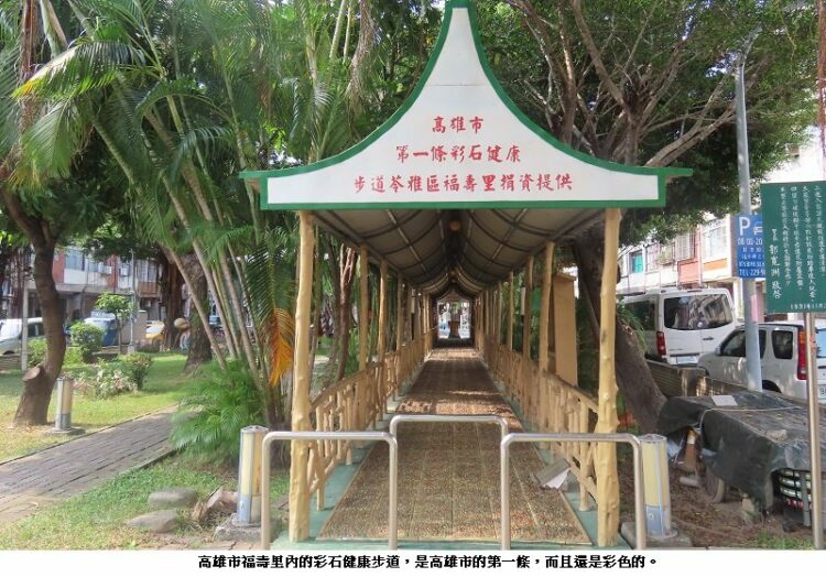 這條健康步道是高雄市第一條彩石健康步道,一砲打響,因為步道上的鵝卵石不是黑白的,而是彩色的,五彩繽紛,踩踏上去就心涼脾土開,晨曦、午、傍晚都有三五成群的里民魚貫踩踏。