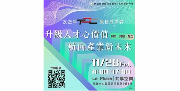 在AI技術驅動與產業快速轉型的浪潮中,如何協助人才看見職涯發展前景、讓企業留任關鍵人才,已成為永續經營的重要議題。勞動部勞動力發展署高屏澎東分署人才資源發展中心(TDC)將於11月28日(週五)上午11時至下午5時,在Le Phare共享空間(新左營館)舉辦「升級人才心價值 航向產業新未來」服務成果展,邀請企業代表與勞工夥伴共同參與,見證今年度在地人才培育與企業輔導的豐碩成果。