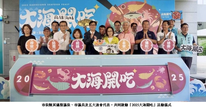 高雄市政府海洋局今(30)日於鳳山行政中心府前廣場舉辦「2025大海開吃」聯合行銷記者會,高雄市長陳其邁親自出席,與海洋局石局長慶豐、民政局閻局長青智、五大漁會、立法委員服務團隊、高雄市議會康議長裕成率眾議員與服務團隊出席共同參與啟動儀式。活動開場由高雄吉祥物「高雄熊」與人氣IP「馬來貘」聯手登場,帶來逗趣的互動熱舞表演,炒熱現場氣氛,正式宣告年度海線系列活動正式啟動。