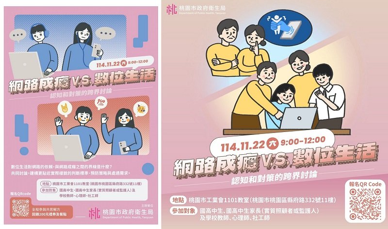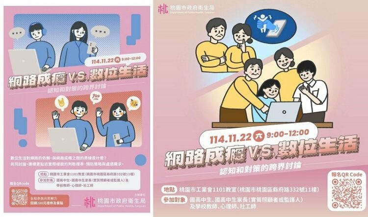為探討青少年網路成癮議題與數位生活的多元挑戰,桃園市將於 11月22日(六)上午9時至12時在桃園市工業會1101教室(桃園區縣府路332號11樓) 舉辦【網路成癮 v.s 數位生活:認知和對策的跨界討論】公民參與工作坊。