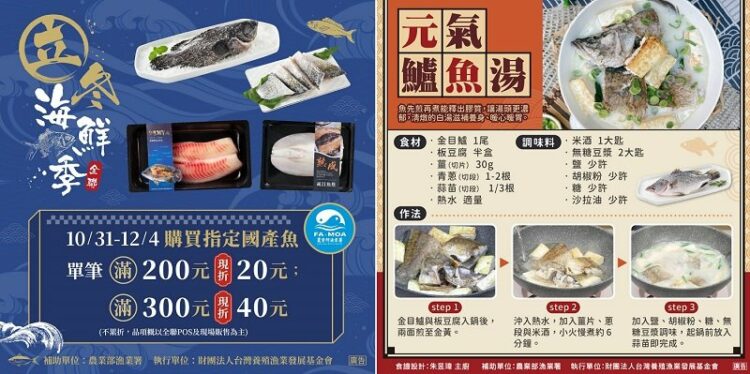 冬令進補正當時!漁業署為推廣當令好魚補冬首選,輔導財團法人台灣養殖漁業發展基金會與全聯攜手合作,以「立冬海鮮季」為主題推廣當令國產優質水產品。活動自10月31日(五)至12月4日(四)止,於全臺超過1,200間全聯與大全聯門市同步推出,消費者凡購買指定國產水產品系列商品,包含虱目魚、臺灣鯛、金目鱸、龍虎斑等魚種,消費滿$200元即可享有現金折抵20元,滿$300元現折40元(單筆不累折)的好康優惠,歡迎民眾把握機會,走進全聯,一起享受補冬暖心鱻味!