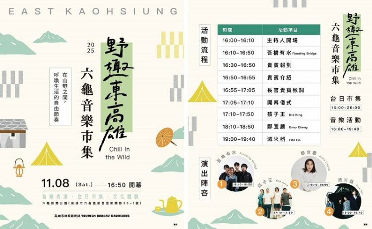 秋高氣爽、適合旅遊的秋季,正是體驗高雄溫泉與山林野趣的最佳時機。由高雄市政府觀光局主辦的「野趣東高雄:六龜音樂×市集」,將於11月8日在六龜新開紀念公園盛大登場。活動以「聆聽土地的邀請」為核心概念,特別邀請日本九州熊本地區的特色店家參與,藉由跨越國界的市集展現地方風土特色,並透過在地觀光活動深化台日交流。同時,更邀請滅火器、鄭宜農等金曲獎重量級卡司輪番開唱,搭配超過40家台日攤商共襄盛舉,帶來特色農特產、原創手作與輕食小點等各類美食餐車,邀您走進東高雄,親身感受秋季山林與音樂交織的療癒魅力。