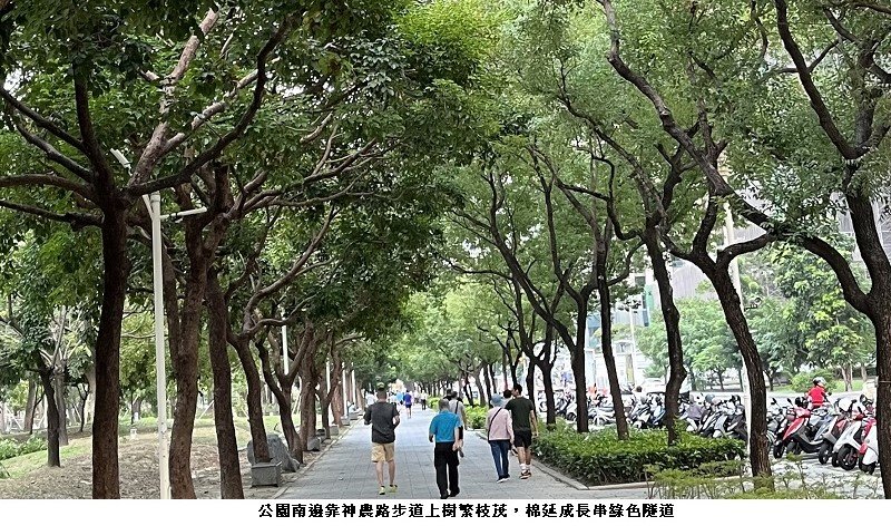在廣達10公頃的凹子底森林公園中,其周邊各有300公尺外圍步道,南邊靠神農路步道,兩側綠樹成林,枝葉交合成長串的華麗傘蓋,密不透光,漫步其間,秋風送爽舒適宜人;其北邊近台灣高等法院高雄分院辦公室前步道上,綠樹亦成環饒富深邃綠意;而在西邊園道與龍德路相鄰歩道,一路到底也是綠樹相連成䕃,步行其中,亦如漫遊綠色時光隧道中,至為賞心悅目。