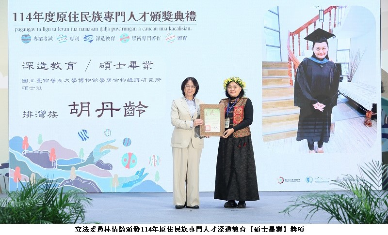 原住民族委員會今(1)日於桃園會展中心舉辦「114年原住民族專門人才頒獎典禮」,由王美蘋Akiku•Haisum主任秘書主持並頒獎,公開表揚在專利、專業考試、學術專門著作、體育傑出人才及深造教育等五大領域取得卓越成就的優秀原住民族人才,展現原住民族群在現代社會中豐沛的生命力與智慧。