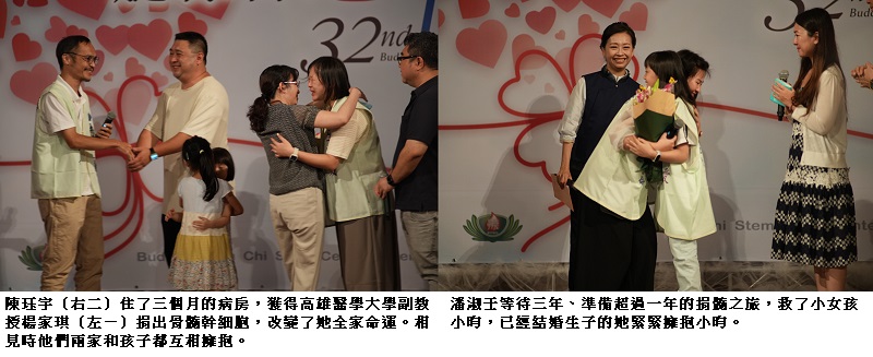 而38歲的陳珏宇則治療過程艱辛,化療帶來嘔吐、發燒、脫皮及膀胱出血等痛苦,加上COVID疫情下的長期隔離,足足住在隔離病房三個月,成為史上住隔離病房最久的人。當她終於可以走出病房,伸出手感受最平常的空氣,都覺得珍貴。如今她已邁入第4年康復期,回首這段歷程,捐贈者改變了她全家的命運,最令她感動的是捐贈者、高雄醫學大學楊家琪副教授寫來的八字留言:「略盡棉薄之力、切勿掛懷」。陳珏宇緊緊擁抱楊家琪的太太。她說,「我的幸運都是醫院、勸髓志工、讓她更懂得珍惜生命與愛,也期許自己要將善意延續,付出實際行動回饋社會。」