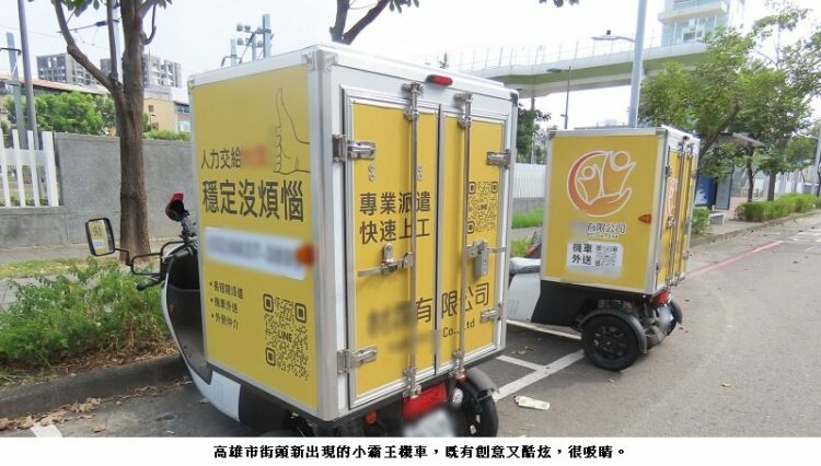 高雄市的街頭,最近出現一種「小霸王」等級的多功能機車,既像廣告車又像物流配送車,後面的置物箱體積幾乎是發財小貨車的一半大,外型精緻像一只小貨櫃,走到那都吸睛,但也有人看了有不同的想法,更擔心會不會被檢舉達人叮上。
