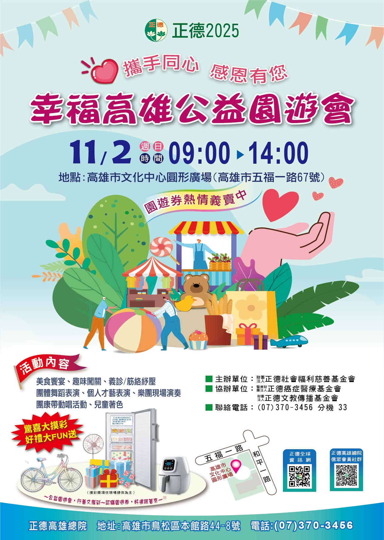 財團法人正德社會福利慈善基金會於11月2日假高雄市文化中心舉辦「幸福高雄公益園遊會」,現場人潮絡繹不絕,氣氛熱鬧又溫馨,吸引眾多民眾熱情參與。高雄市市長陳其邁特別蒞臨現場致詞,肯定正德長年深耕社會公益的用心與行動,並親自抽出「市長獎」,現場歡呼聲不斷,幸福洋溢。
