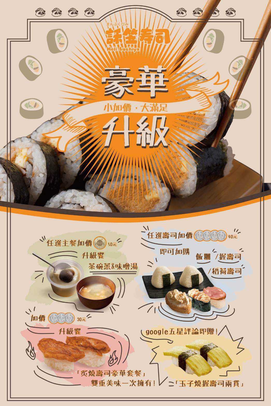 活動期間,凡點任一主餐只需加價50元即可升級「茶碗蒸+味噌湯雙饗組」,加價40元可再加購飯糰、握壽司或稻荷壽司,想更豐盛還可加價30元升級炙燒壽司雙拼,一次擁有雙重美味!