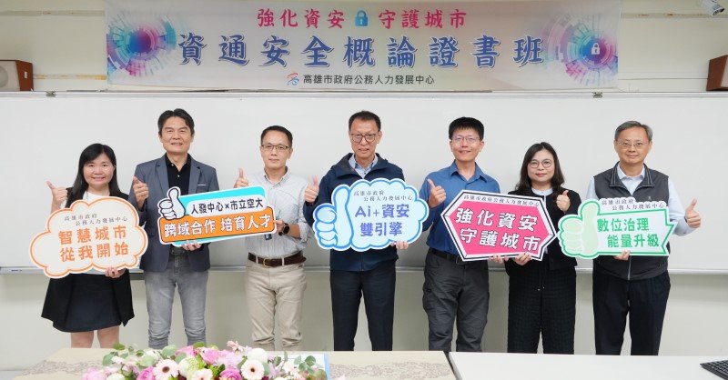 高雄空大與高雄市政府公務人力發展中心合作開辦「資通安全概論」專班共有兩梯次,首梯次於今(4)日正式開班。高雄市政府副秘書長王宏榮、研考會主任秘書郭榮哲、人事處專門委員許詩蘩、政風處副處長王俊凱、資訊處處長劉俊傑及人發中心張雅閔主任等親臨開訓典禮,充分展現市府團隊對資安教育的高度重視。