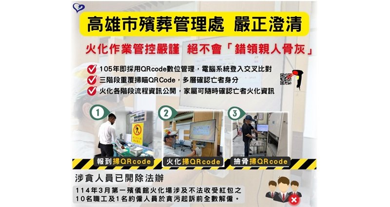 殯管處表示,高市火化作業流程自105年建立QRcode機制,各階段皆採數位化管理,三階段重複掃描QRCODE以確認亡者大體身分,並經電腦系統登入及交叉比對,確保火化作業資訊與大體身分正確一致,如有異動調整火化時間,作業流程仍持續由資訊系統監控把關,絕不會有「錯領親人骨灰」之情事發生。