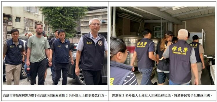 近日國內街頭及許多夜市出現2名外籍人士坐在路邊,並手持中文手寫紙板「銀行卡遭凍結,需要籌措醫療費用…」等字樣,向路過民眾乞討捐款。移民署得知消息,立即指派專勤隊人員於各重點區域連日查訪,今(4)日高雄市專勤隊與高雄市政府警察局左營分局新庄派出所共同查獲,後續將依違反入出國及移民法予以驅逐出國。