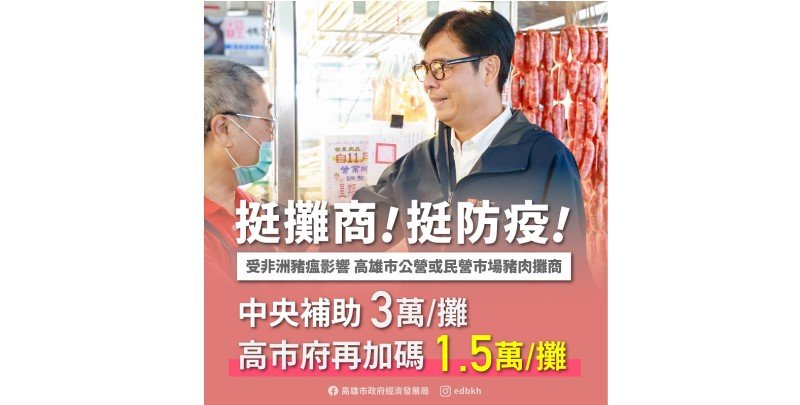 為落實非洲豬瘟防疫工作並兼顧攤商生計,高雄市傳統市場許多豬肉攤商主動配合防疫政策,自主暫停營業。高雄市長陳其邁感念攤商在防疫關鍵時期的辛勞與合作,今(6)日宣布,除全面免收公有市場豬肉攤位使用費一個月外,配合經濟部公布傳統市場生鮮豬肉攤每攤補助3萬元,市府再加碼補助高雄市每攤1.5萬元,以實際行動支持攤商,攜手共同度過防疫與經營的雙重挑戰。