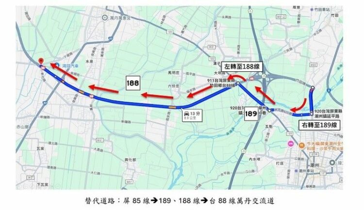 交維措施:引導下萬丹交流道出口匝道,延188線由大發交流道續行台88線往高雄。