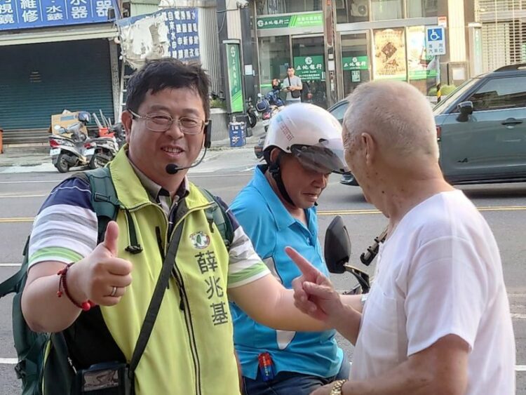 在國昌里長陳健成陪同下,薛兆基肩背文宣袋、手持名片,隨著垃圾車的路線緩步前行。每當音樂響起、居民走出家門倒垃圾時,他便主動上前問候、寒暄,並簡短介紹自己的理念與政見。現場氣氛自然親切,不時傳出笑聲與鼓勵。