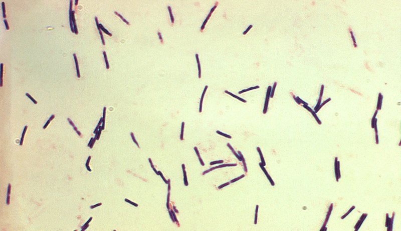 圖:顯微鏡下呈革蘭氏陽性的魏氏梭菌(產氣莢膜梭菌)。維基百科