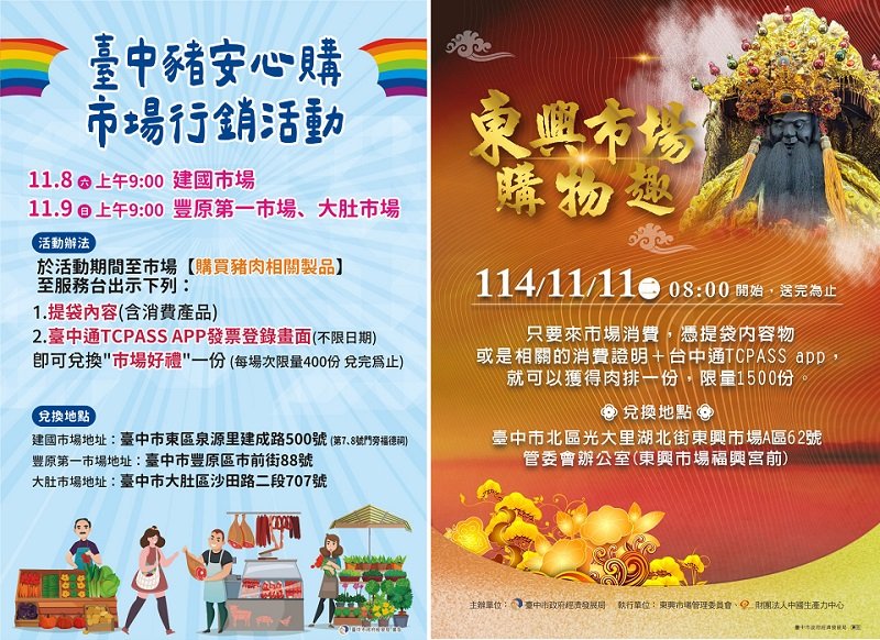 經發局補充,11月11日東興市場活動搭配傳統信仰文化。三國時代的「張飛」為台中市東興民有零售市場福興宮主祀神明,農曆9月辦理聖誕千秋大典,深受當地民眾重視,同時也是在地傳統信仰文化的展現與傳承。為了響應活動熱潮,市府與東興市場管理委員會攜手推出此次活動,歡迎大家一起熱鬧慶祝、體驗傳統信仰文化,再吃豬排迎好運。