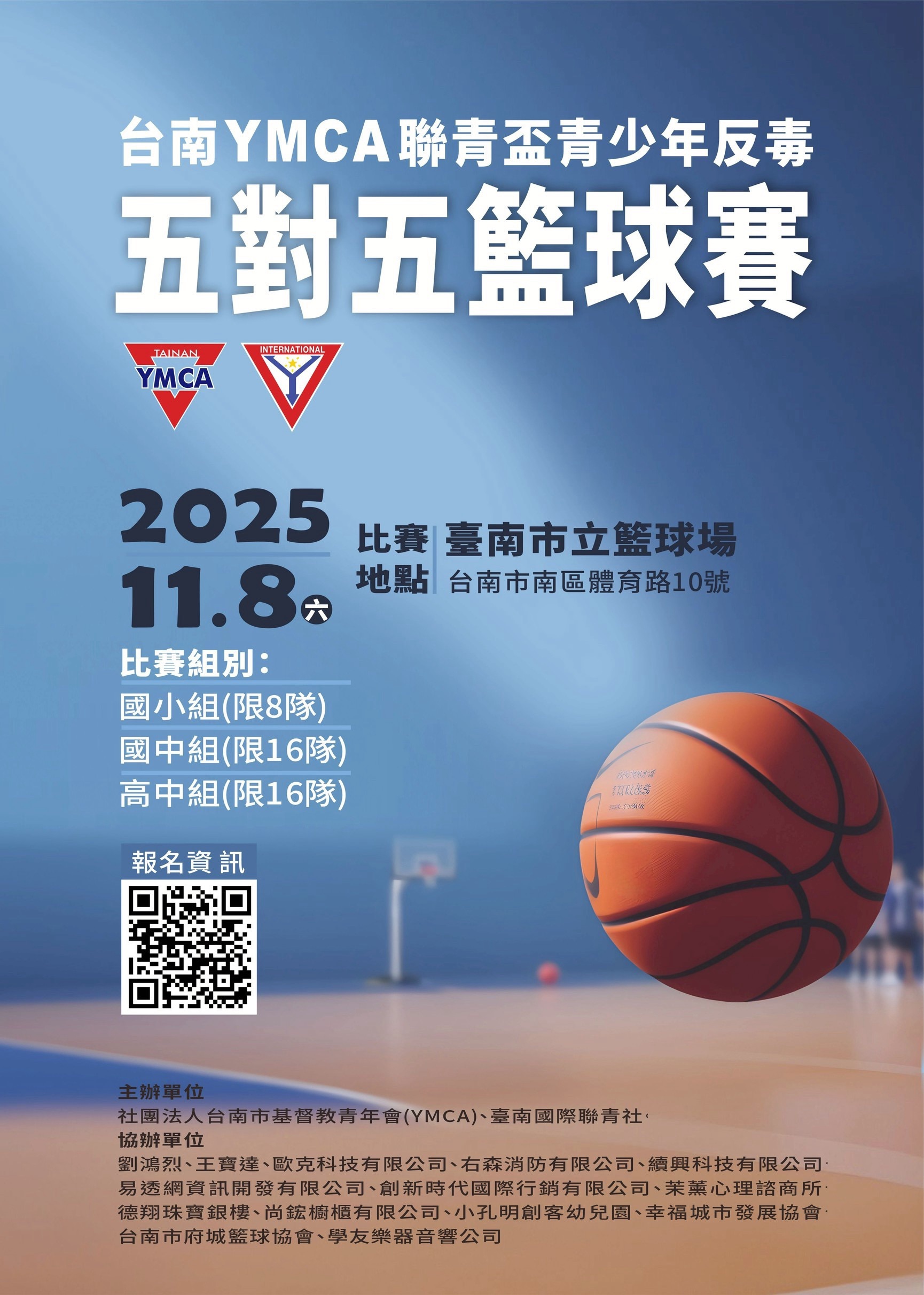 2025年11月8日(星期六)上午,「台南YMCA聯青盃青少年反毒五對五籃球賽」於台南市立籃球場熱血開打!本次賽事由社團法人台南市基督教青年會(YMCA)與台南國際聯青社共同主辦,號召全市國小、國中及高中組球隊齊聚一堂,透過球場上的汗水與團隊合作,傳遞「青春無毒,熱血正能量」的理念。