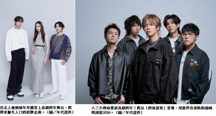 「2026雄嗨趴」高雄跨年晚會自公布陳漢典、阿本、木木等主持陣容及今年剛發片的Lulu黃路梓茵首度以歌手身分登上高雄跨年舞台後,成為社群熱門話題,告五人及八三夭兩大人氣樂團公布,讓高雄跨年討論熱度再度飆升!無論是隨著告五人的深情搖滾共鳴,還是與八三夭熱唱,夢時代前的時代大道即將化身全臺最嗨的跨年現場,號召全臺粉絲齊聚高雄,留下最難忘的跨年回憶。