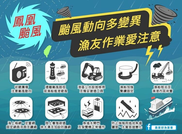 漁業署呼籲箱網及淺海牡蠣養殖業者,應加強固定海上網具及纜繩等設施;定置網業者,亦應檢視並強化框架、浮球、網片及纜繩等設施之防護,確保設施穩固安全。