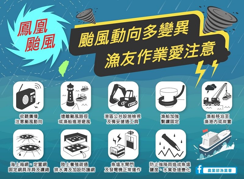 漁業署指出,已要求各漁港管理機關加強港區公共設施之防護與排水系統疏通等防颱整備作業,須對進港避風漁船筏完成妥善停泊安排。同時,通知本次颱風侵襲路徑暴風半徑區域內漁船筏船主應強化纜繩固定作業及針對所屬船舶及早做好防颱準備,在颱風侵襲前請停在泊區,尚未進漁港防颱避風的船筏,應儘速進港避風,移泊至漁港內或岸置,亦要求各區漁會落實所轄魚貨直銷中心、辦公處所及消費地魚市場等設施的防颱整備工作。