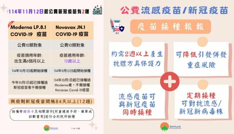 衛生局表示,今年公費流感疫苗第二階段(50至64歲無高風險慢性病成人)已於11月1日起展開,11月12日 起公費新冠疫苗有2個選擇,由於接接種疫苗後約需兩週才有足夠的保護力,提醒民眾儘早接種,尤其是65歲以上長者、幼兒、慢性病患等高風險族群應趕快接種,可降低併發重症及死亡的風險。