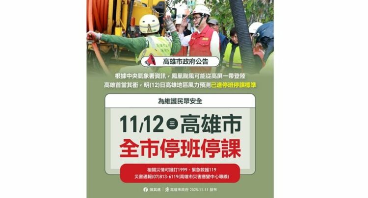 波新聞─李至文/高雄根據中央氣象署最新資料顯示,鳳凰颱風可能自高雄、屏東一帶登陸,預估明(12)日高雄地區平均風力可達7級,最大陣風達10級,已達停班停課標準。高雄市政府為確保市民安全並落實防颱準備,宣布明日全市停止上班、停止上課。