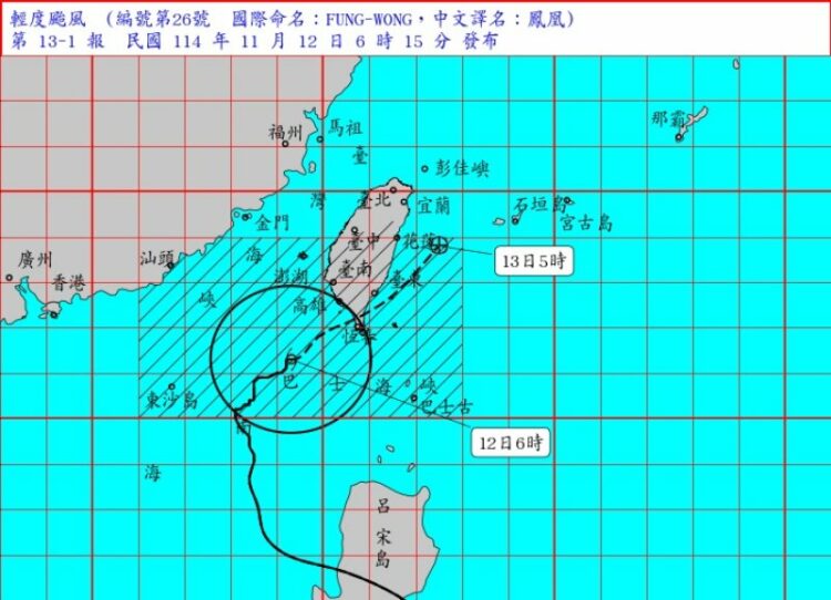 氣象署統計,10日凌晨0時至12日上午6時累積雨量,宜蘭東澳嶺1061.5毫米,新北大粗坑752.5毫米,台北擎天崗549毫米,台東牛頭山422毫米,基隆國一S001K 410毫米,花蓮秀林359.5毫米,屏東大漢山297毫米,桃園四稜244.5毫米;陣風方面,蘭嶼12級,彭佳嶼11級,恆春、東吉島、新屋10級。