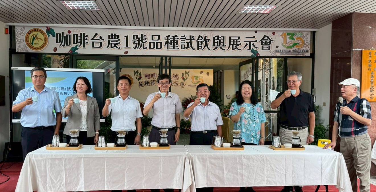 在全球氣候變遷與消費市場不斷變化的背景下,臺灣咖啡產業迎來嶄新的一頁,農業部農業試驗所歷經多年研究與培育,成功育成臺灣首個本土咖啡品種「台農1號」,不僅突破中低海拔種植的瓶頸,更以獨特風味與穩定產量,為國產咖啡開啟全新發展契機。「台農1號」風味獨特,具堅果香氣、溫和果酸、體脂感厚、滋味濃郁餘韻長、口感優秀。其葉片更富含具機能性功效的綠原酸可製造保健咖啡葉茶飲,亦可應用於美容保養如面膜等護膚產品之原料供應,為咖啡農創造咖啡豆以外的加值收入,實現農業資源的全方位加值利用。經國際標準杯測驗證,「台農1號」在低海拔生產的生豆烘焙後,風味可達精品咖啡(SCA 82分以上)等級。農業試驗所研究咖啡已有百年歷史,為推廣研究成果並促進台灣咖啡的多元應用,特於11月11日在嘉義分所舉辦「台農1號咖啡試飲與展示觀摩會」邀集產官學研單位與各地咖啡農實地觀摩並品評咖啡風味,由農試所嘉義代分所長張哲瑋與歷任分所長一起沖泡該咖啡,邀現場民眾在戶外休閒咖啡座上一起分享品嚐,咖啡香帶動現場熱絡氣氛。現場也展示「台農1號」副產品加值製作的美容護膚保養品,綠原酸保健飲品等多元產品,期盼此品種帶動臺灣咖啡品牌化,提升國產咖啡競爭力,拓展更具多元產值的本土咖啡產業未來。