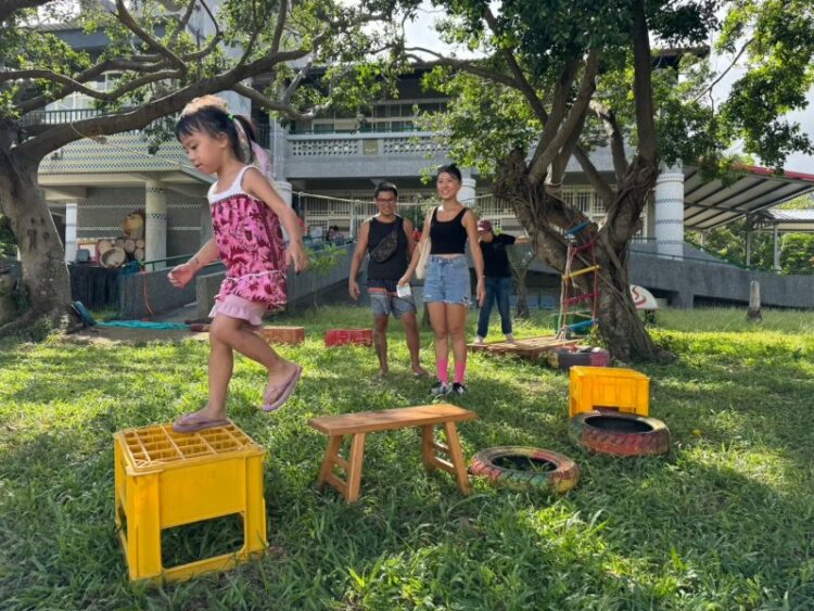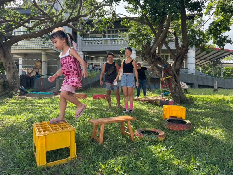 滿州鄉位於恆春半島,是縣內相對偏遠的地區,公共設施與兒童活動空間較少。為了讓滿州地區的孩子也能享受到遊戲平權,讓家長在陪伴中發現與孩子互動的樂趣,此次活動選在日日旅海民宿前大草坪,結合自然素材與趣味挑戰,規劃六大遊戲主題,「草坪闖關」──跳過路障與走平衡木挑戰鍛鍊大肌肉發展與協調力,讓孩子玩出自信與成就感;「用風吹泡泡」──運用恆春半島特有的落山風,吹出巨型泡泡;「風的忍者」──用紙張、繩子與想像力打造專屬忍者裝備,摺出風車與手裡劍,激發創造力;「草地創意競走」──在草地上使用布袋變成袋鼠,或是用紙箱創作出自己的交通工具,在草地上盡情釋放體力;「寶寶球池區」──為年幼孩童設置安全軟球池,自由探索玩樂;以及「最強防風塔」──以冰棒棍、繩子、黏土等素材,打造能抵抗強風的防風塔,啟發孩子的邏輯與科學思維。