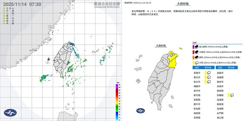 中央氣象署今晨持續對北北基及宜蘭等4縣市發布大雨特報,今(14)日持續受東北季風影響,迎風面基隆北海岸、東北部地區及大台北山區有局部短暫雨,桃園以北、花東地區及新竹以南山區雲多偶有零星降雨,中部地區清晨仍有零星降雨機率,整體水氣逐漸減少,白天新竹以南地區以多雲到晴的天氣為主。