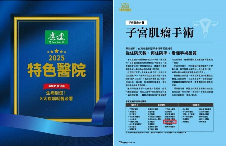 《康健》2025年度特色醫院評選由專家團隊依據多項疾病照護指標進行評比,其中在腎臟病與子宮肌瘤手術照護兩大項目中,阮綜合醫院榮獲「全國區域醫院」入選殊榮,展現其專科實力。