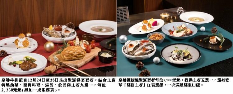 皇饕牛排館鐵板燒以極致職人手藝詮釋聖誕美味,於12月24日至28日帶來節慶餐桌上的經典對話。牛排館推出聖誕饗宴套餐,結合主廚特製前菜、開胃料理、湯品與飲品,再從九款主餐中挑選一道心儀美味,從炙香牛排、香煎海鮮到豐腴鴨胸,每一口都如節日樂章般豐富,每位2,380元起。鐵板燒聖誕套餐每位2,980元起,提供主餐五選一,餐點包含「日本A5和牛肋眼」、「美國頂級老饕牛排(限量)」與「鱈場蟹腳」等頂級食材,現場鐵板高溫煎封香氣,肉香與海味交錯縈繞,還有豪華「雙拼主餐」任君選擇,一次滿足雙重口感。上述菜色依時令調整,價格需另加一成服務費。訂位專線:(07)559-6917。