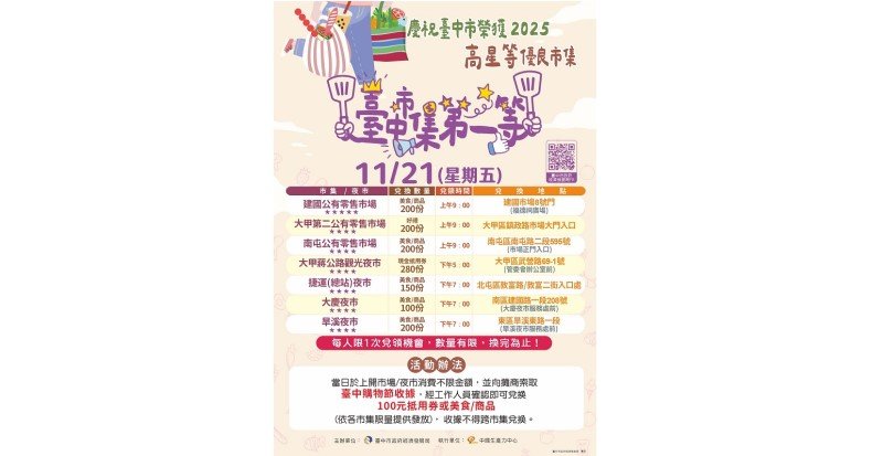 一年一度的菜市場金馬獎-經濟部「2025台灣五星集~優良市集暨樂活名攤評核」成績公布,台中市傳統市集以總星數2,481顆星再度登上衛冕寶座,相較於第二名新北市1,570顆星及第三名桃園市1,361顆星遙遙領先,創下連續六年總星數蟬聯全國第一名新紀錄。台中市政府經發局將於11月21日在四星及五星認證傳統市集推出「台中市集第一等」活動,邀請民眾一起逛市集、拿好康,分享台中傳統市場的星級魅力!