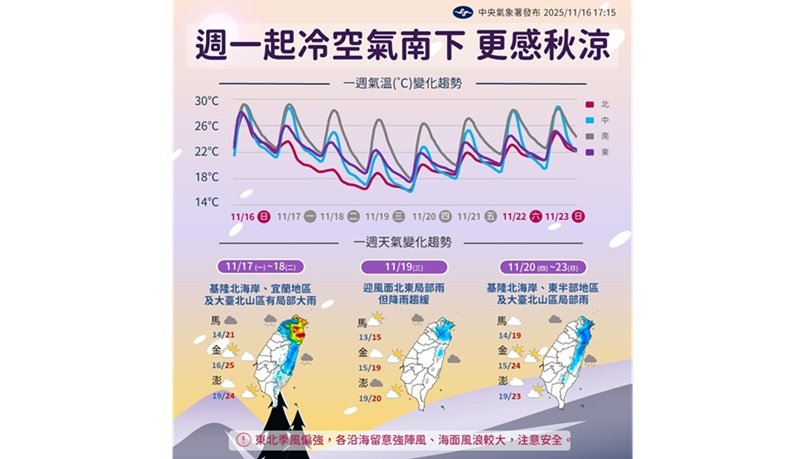 中央氣象署指出,今日(17日)東北季風增強,將是入秋以來抵達台灣最強的一波冷空氣,北台灣氣溫率先開始下降,天氣愈晚愈涼,桃園以北及宜蘭上半天氣溫約21到24度,到了晚上會降到19、20度,至於其他地區早晚低溫20至22度,白天仍較為舒適溫暖,高溫約26至30度。
